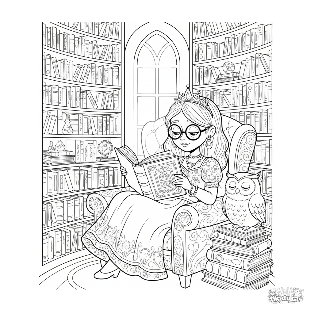 Сложная раскраска для детей 10-12 лет: принцесса-учёная в очках читает древний фолиант в кресле в круглой башенной библиотеке, освещённой лунным светом, рядом спит сова.
