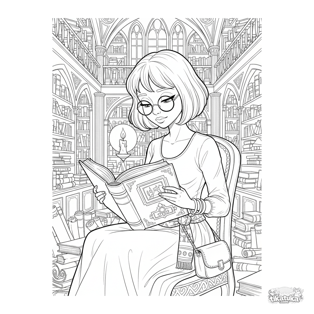 Детальная раскраска для детей 10-12 лет: учёная принцесса в очках читает огромный фолиант в древней библиотеке среди бесчисленных книг.