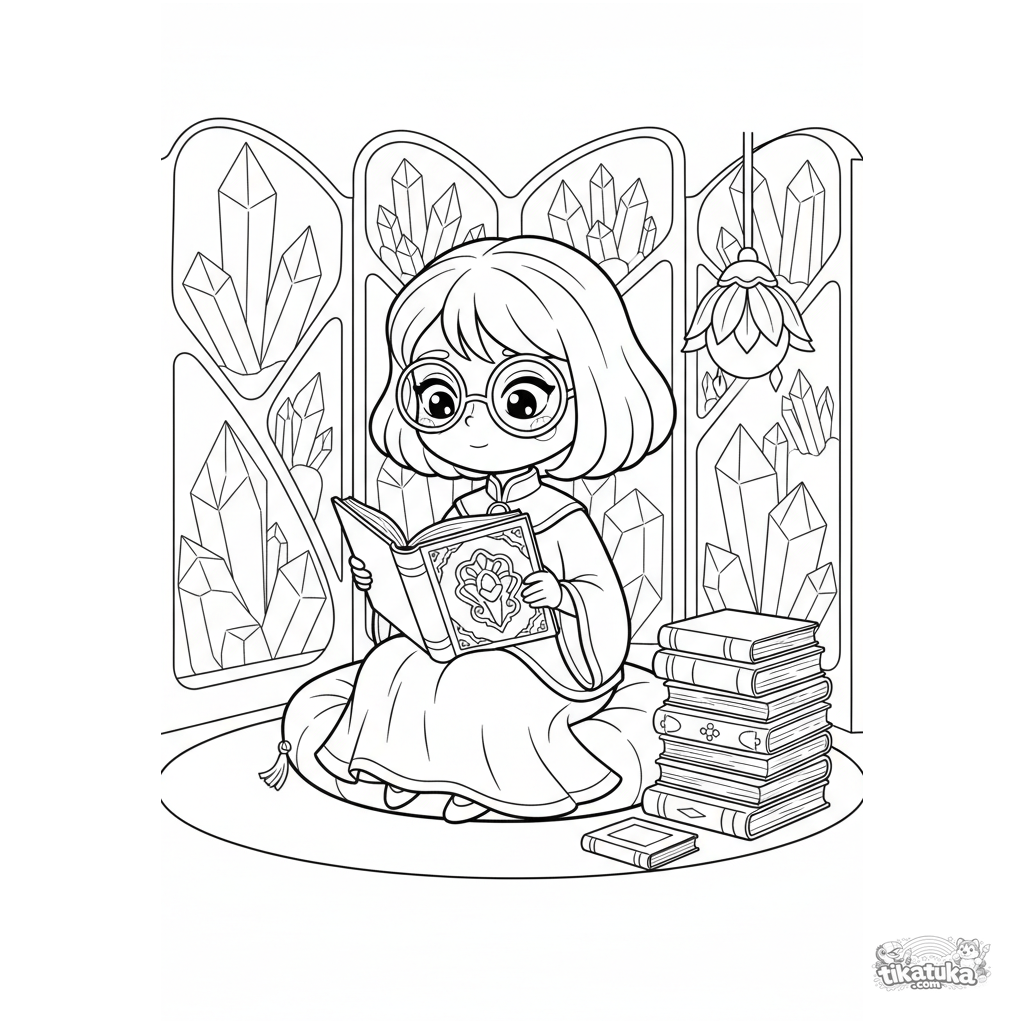 Раскраска для детей 7-9 лет: ученая принцесса в очках читает древнюю книгу в волшебной библиотеке из кристаллов. Задумчивая атмосфера.