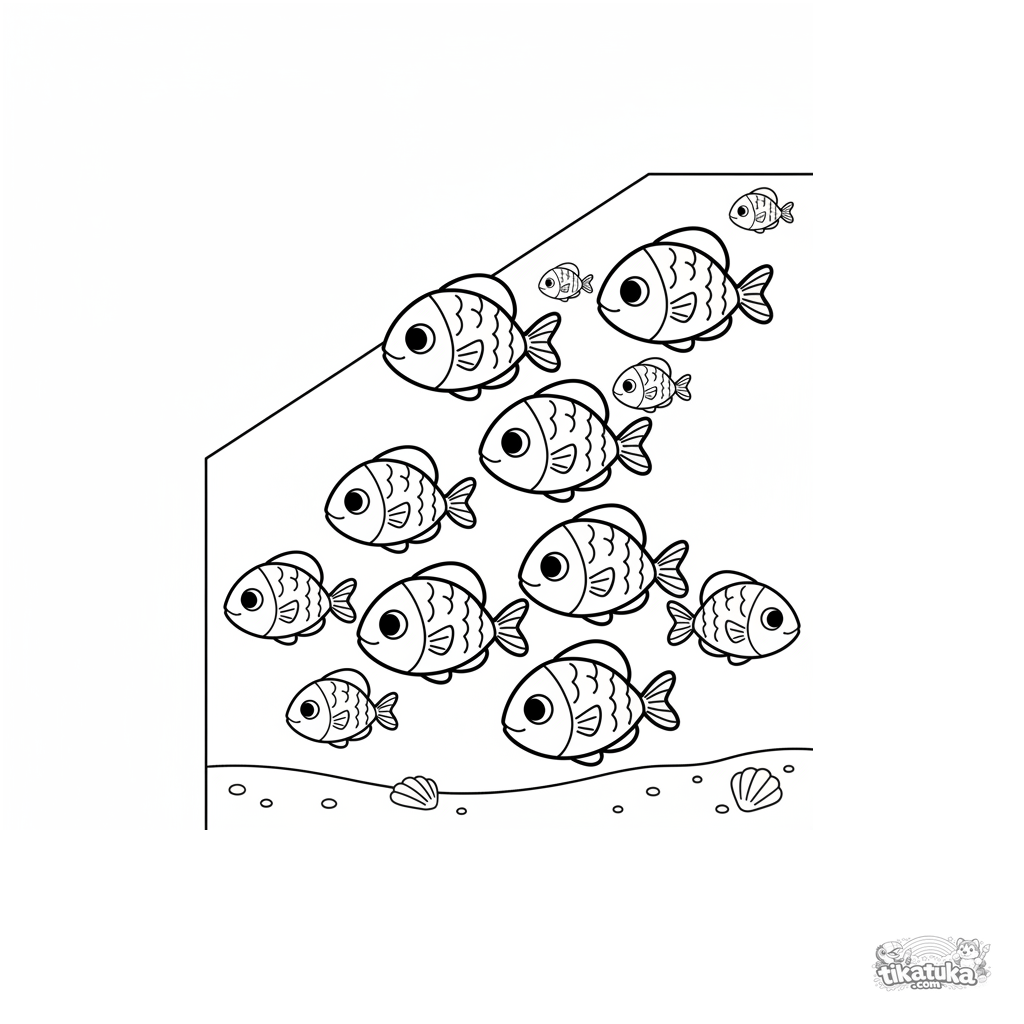 Раскраска для детей 7-9 лет: стайка серебристых рыбок синхронно плывет в луче солнца над песчаным дном мелководья. Стиль бумажной аппликации.