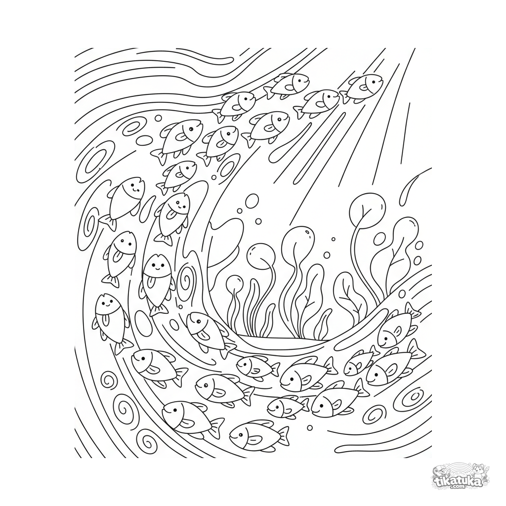 Раскраска со стайкой рыбок, плывущей через солнечные столбы на мелководье. Для детей 7-9 лет. Современный плоский векторный стиль, динамичная композиция.