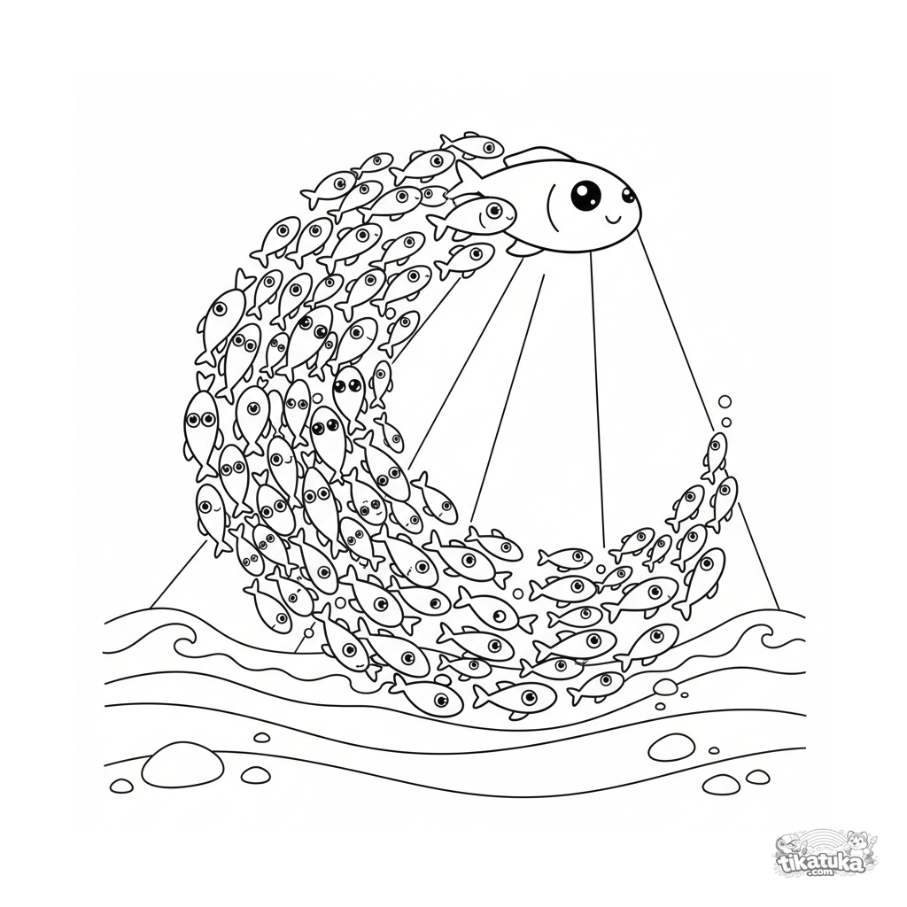 Раскраска для детей 4-6 лет: стайка серебристых рыбок резвится в луче солнца на мелководье. Динамичная сцена с акварельным настроением.