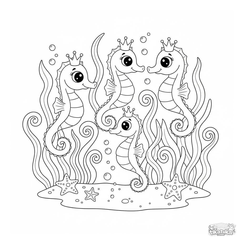 Раскраска для детей: морские коньки весело танцуют среди закрученных водорослей в подводном мире. Динамичная сцена с пузырьками, подходит для возраста 4-6 лет.