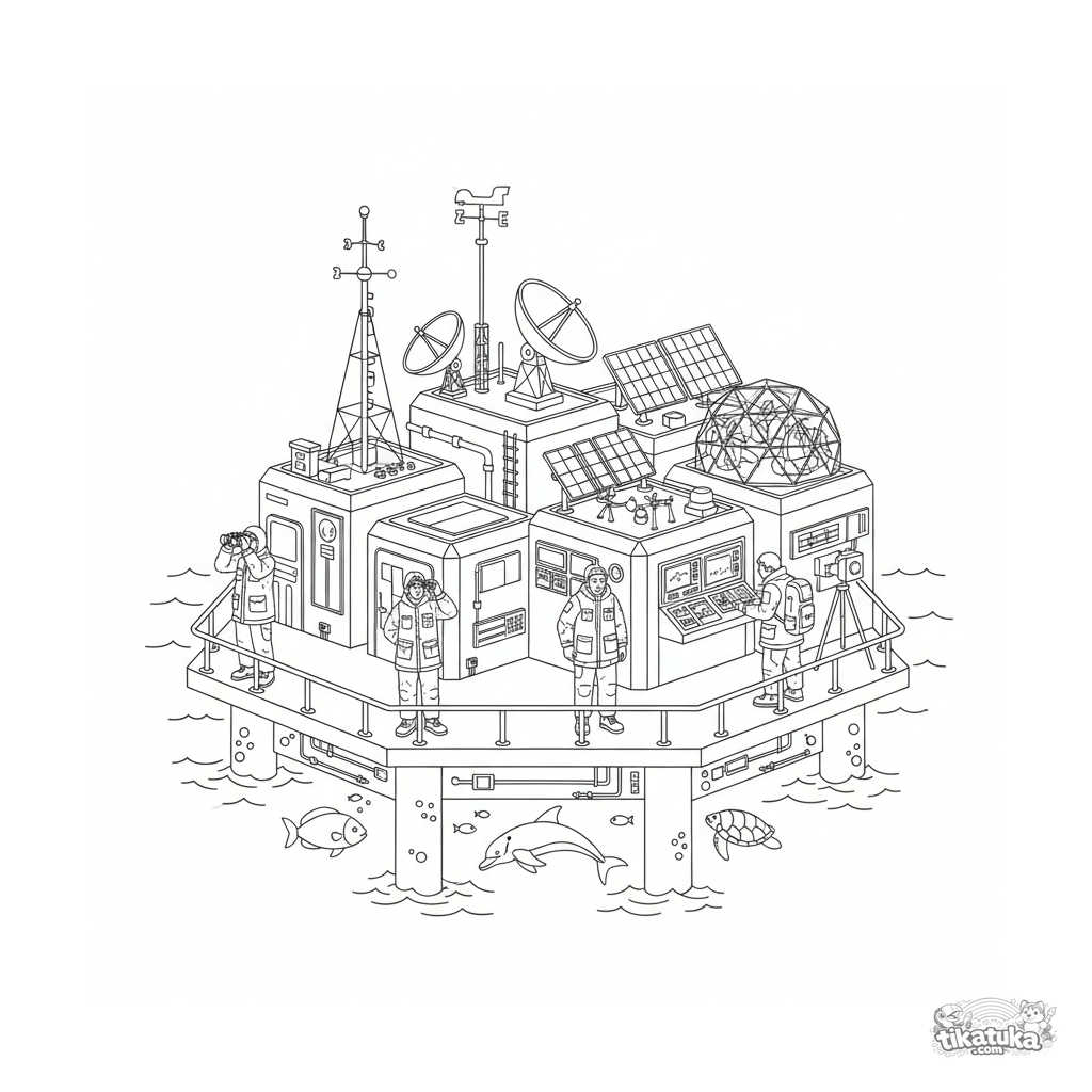 Раскраска: детализированная научно-исследовательская станция на плавучей платформе в море для детей 10-12 лет. Изображены приборы, антенны, солнечные панели и учёные за работой.