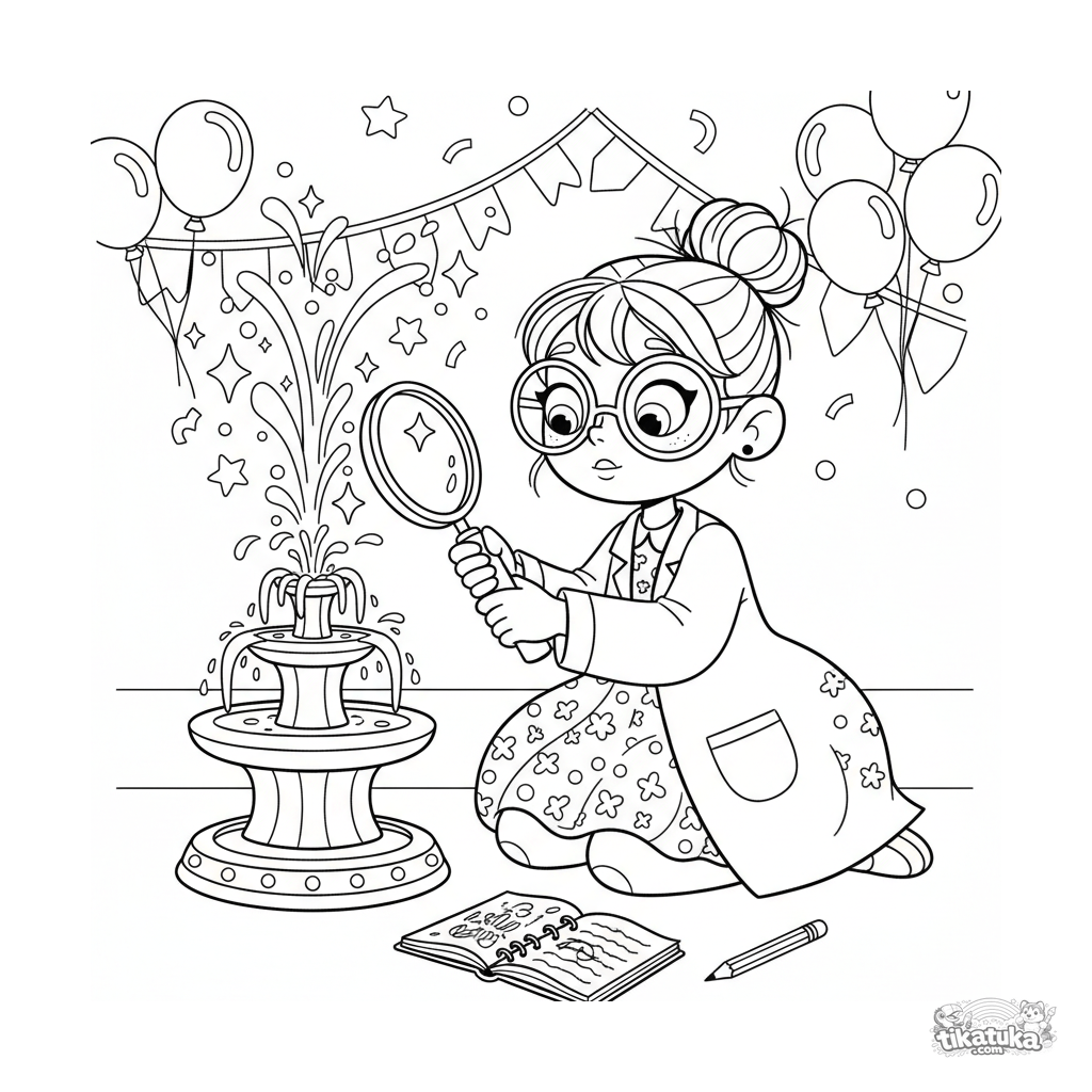 Раскраска для девочек 7-9 лет: юная ученая в очках и халате с любопытством изучает блестящий декоративный фонтан в праздничном зале с помощью лупы. Сцена с деталями.
