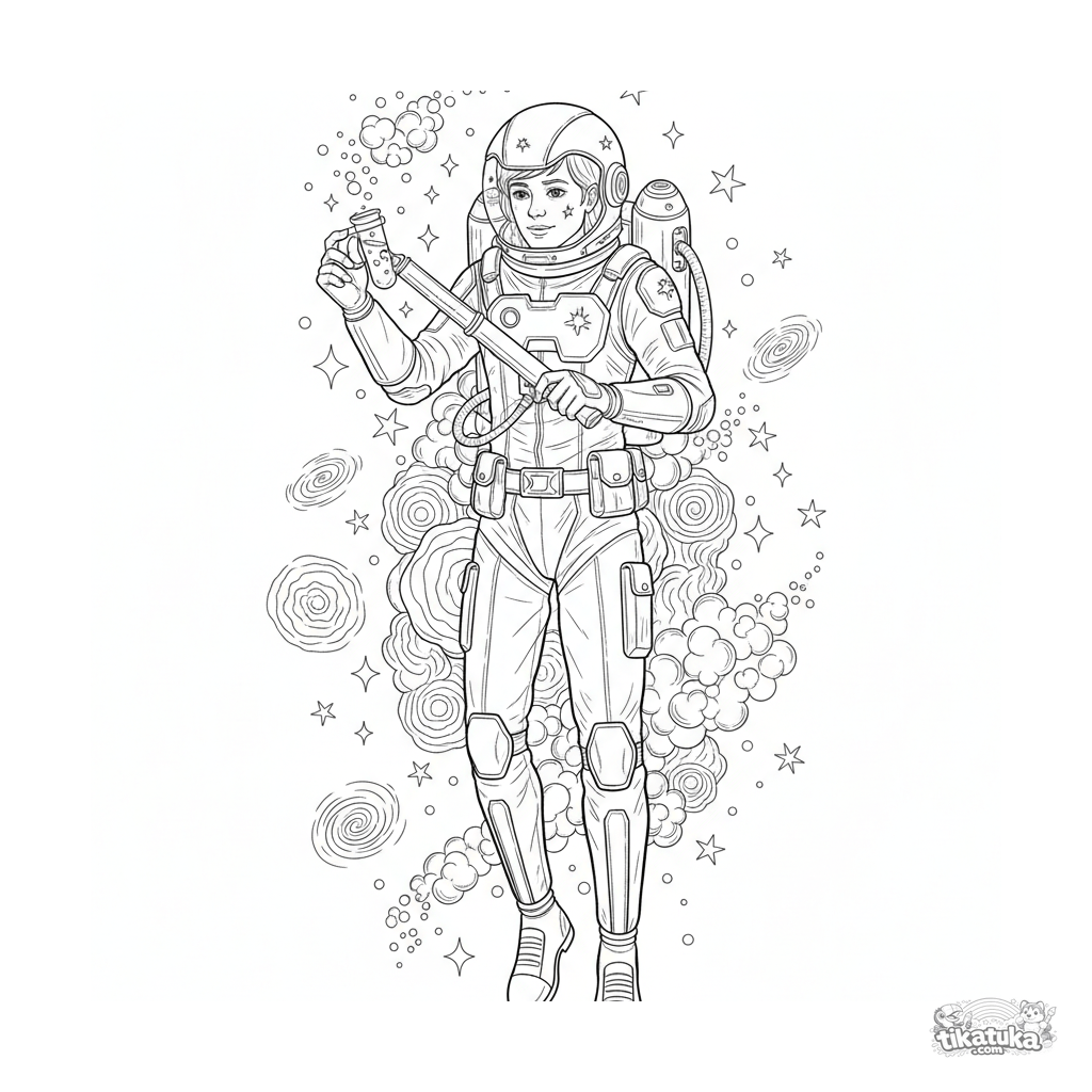 Раскраска для детей 10-12 лет: ученый в реактивном ранце работает в открытом космосе, собирая образцы звездной пыли среди звезд. Технический стиль, детализированное оборудование.