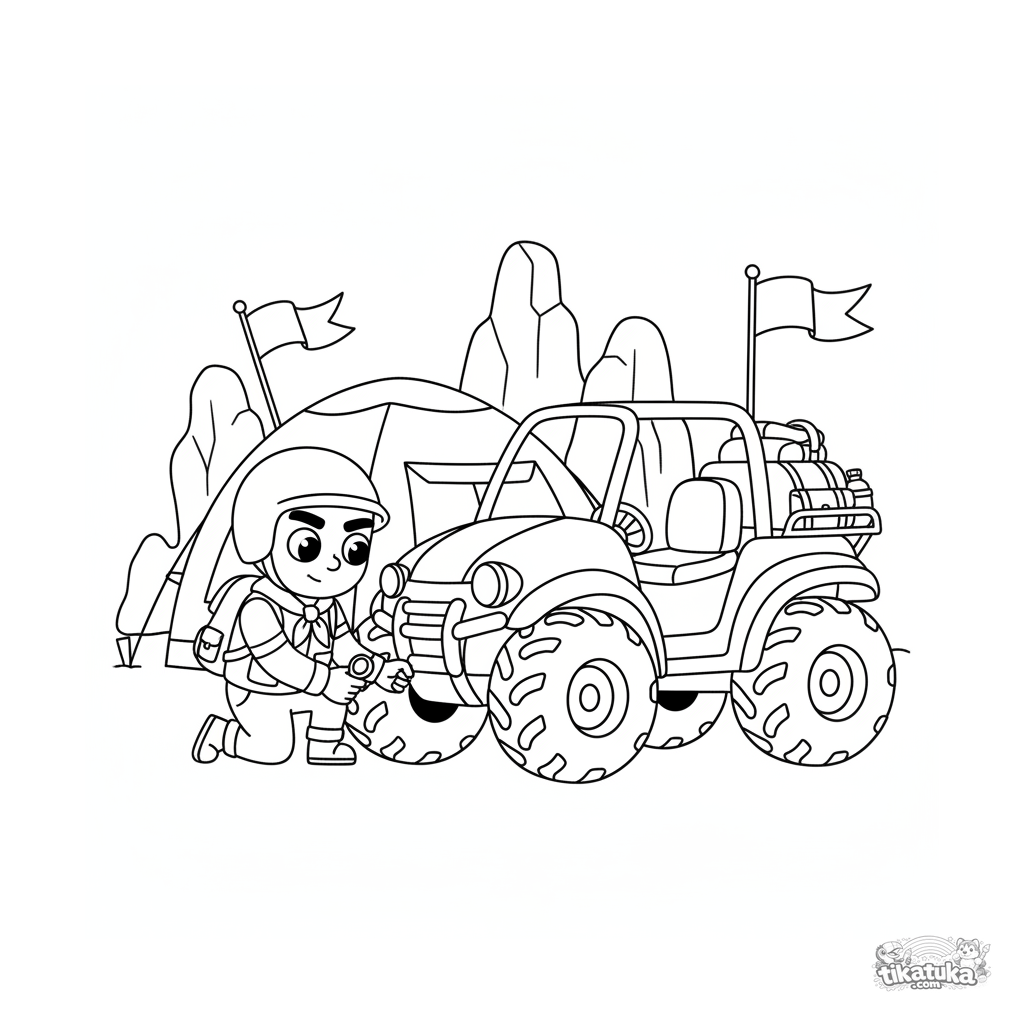 Раскраска разведывательный квадроцикл возле штабной палатки. Для детей 7-9 лет. Изображён ATV с большими колёсами, разведчик проверяет давление, рюкзак и фляга.