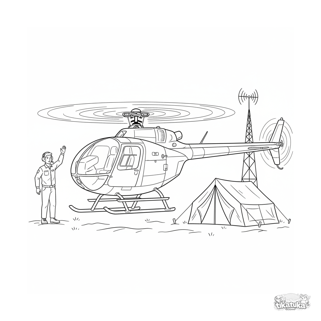 Детальная раскраска для детей 10-12 лет: разведывательный вертолёт совершает посадку возле полевого командного пункта с палатками. Реалистичный стиль.
