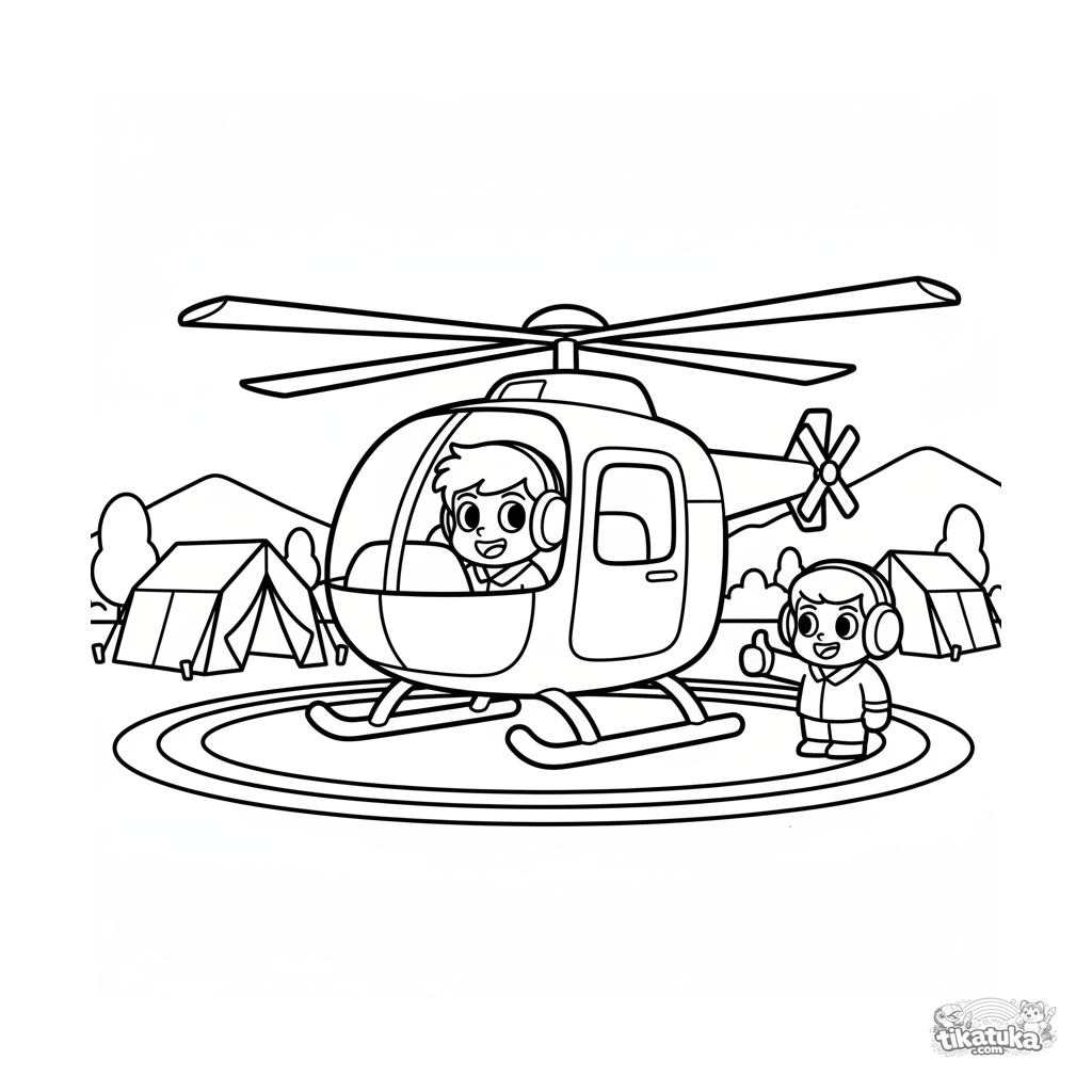Раскраска для детей 7-9 лет: разведывательный вертолёт на импровизированной площадке у полевого штаба. Пилот и член наземной команды обмениваются сигналами, лопасти недвижны.