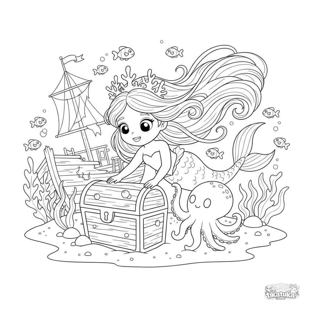 Раскраска для детей 4-6 лет: морская принцесса с волшебными волосами исследует затонувший корабль на дне океана вместе с осьминогом и стайкой рыб.