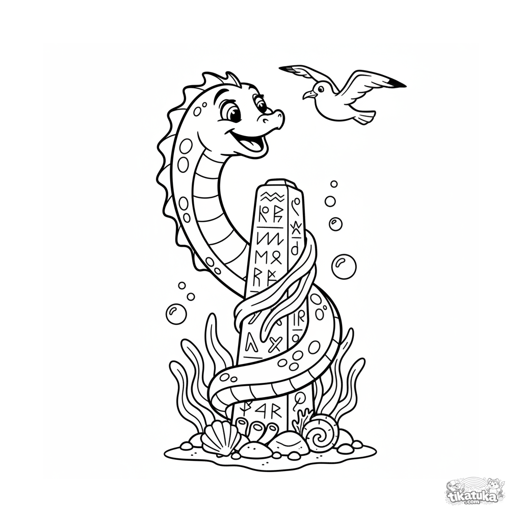Раскраска для детей 7-9 лет: дружелюбный морской змей обвивает покрытую водорослями руническую колонну. Динамичная поза, умеренная детализация чешуи и окружения.