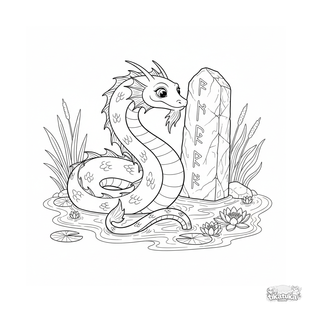 Сложная раскраска для детей 10-12 лет: дружелюбный морской змей обвивает полузатопленный рунический монолит в лесном озере. Детализированные чешуйки, водные растения и древние символы.