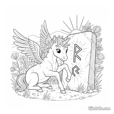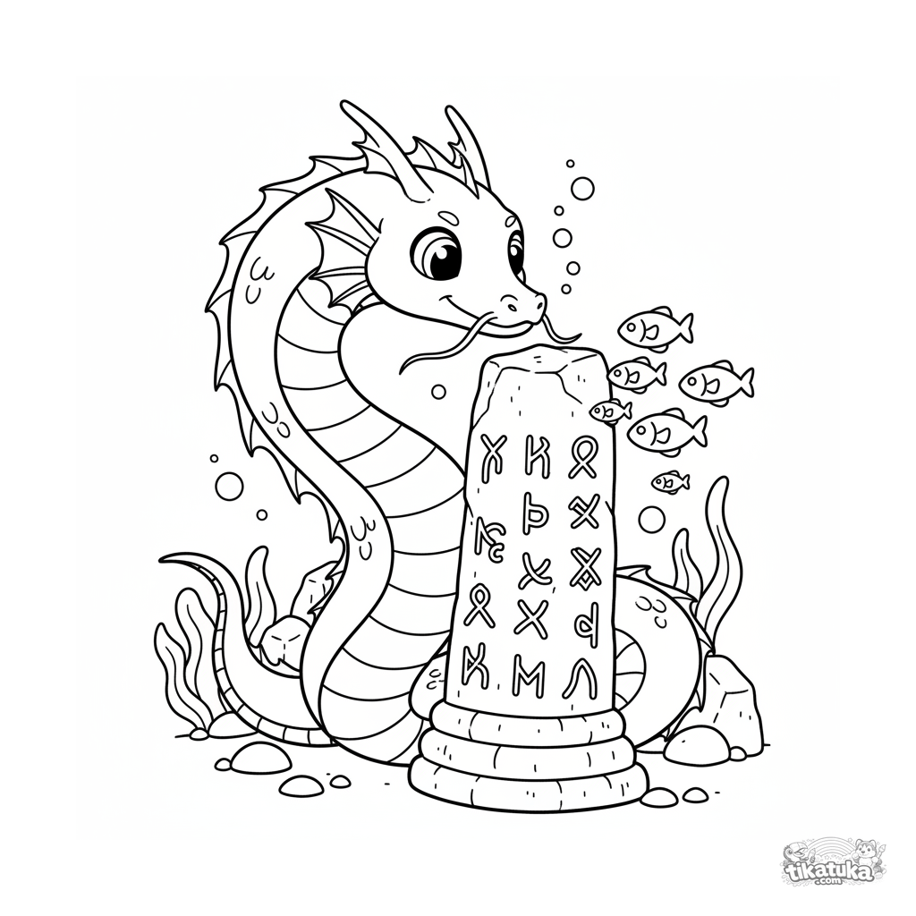 Раскраска для детей 4-6 лет: дружелюбный морской змей играет вокруг подводной колонны с рунами. Четкие формы, умеренный фон.