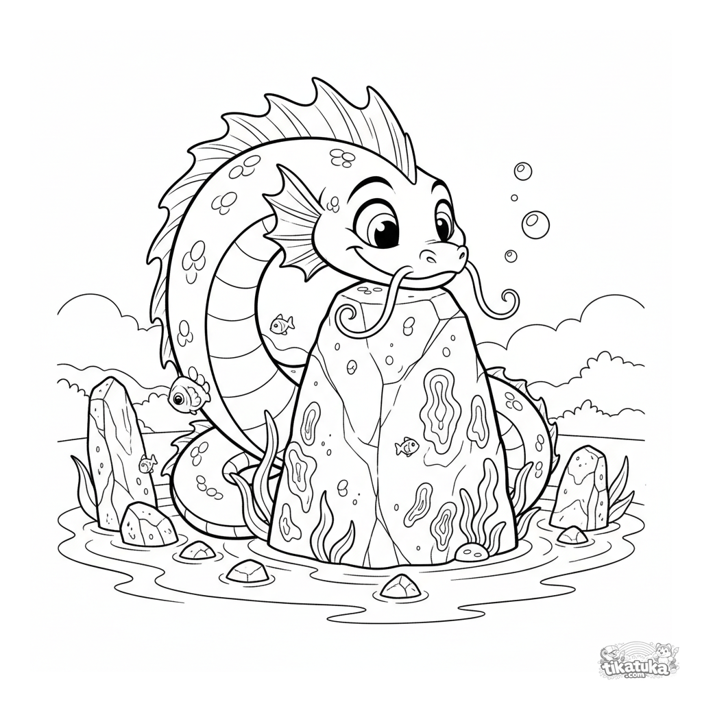 Раскраска для детей 4-6 лет: дружелюбный морской змей отдыхает, обвившись вокруг покрытого водорослями рунного камня в пруду среди монолитов. Умеренная детализация.