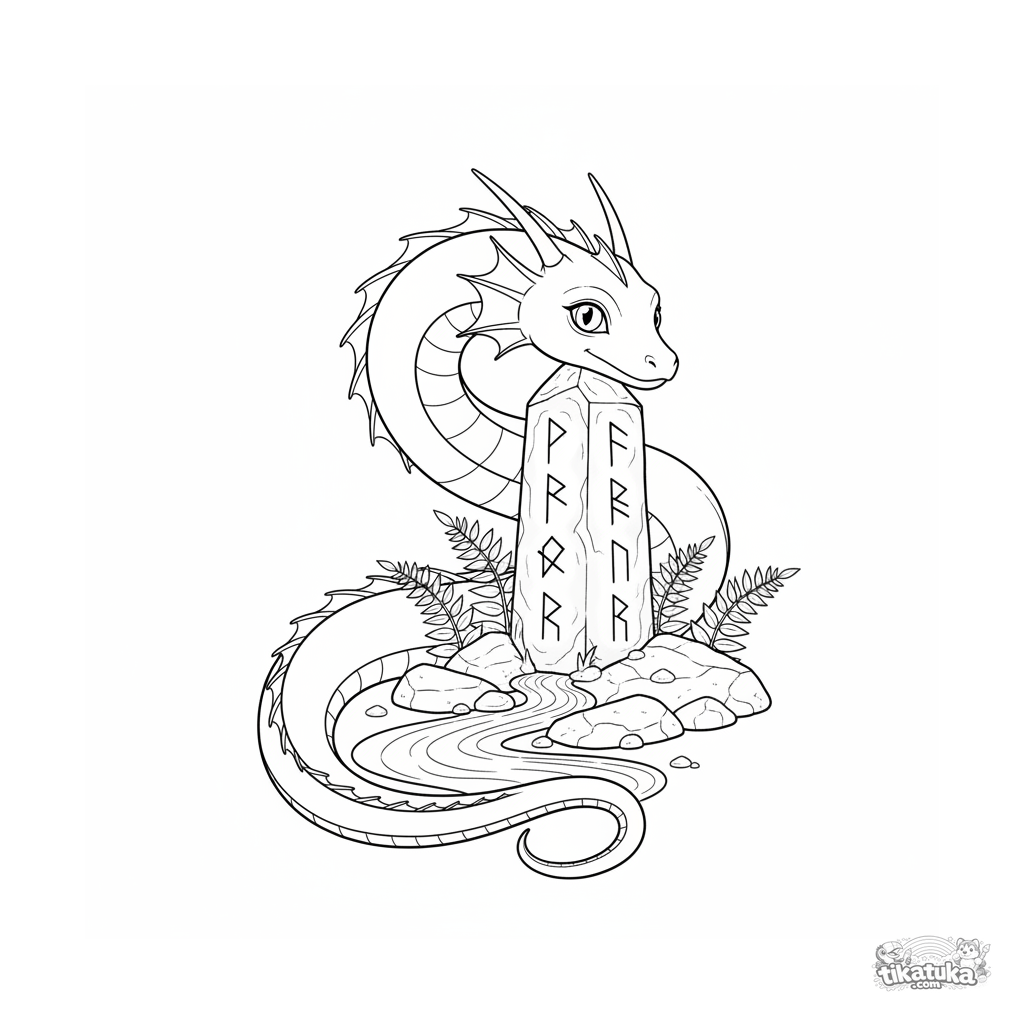 Раскраска для детей 10-12 лет: детализированный морской змей обвивает древний рунный монолит у ручья. Сцена в натуралистичном стиле для опытных художников.