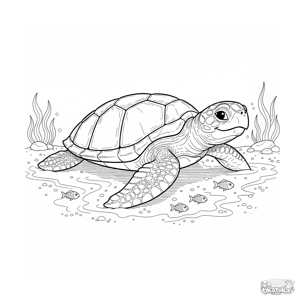 Раскраска с морской черепахой, мирно отдыхающей на солнечной отмели. Для детей 7-9 лет. Изображены мелководье, песок и солнечные лучи, пробивающиеся сквозь воду.