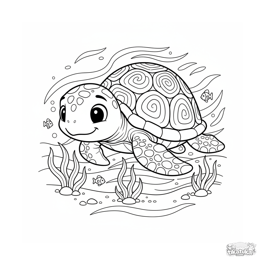 Раскраска с морской черепахой, пасущейся на водорослях в солнечном мелководье. Классический мультяшный стиль для детей 4-6 лет.