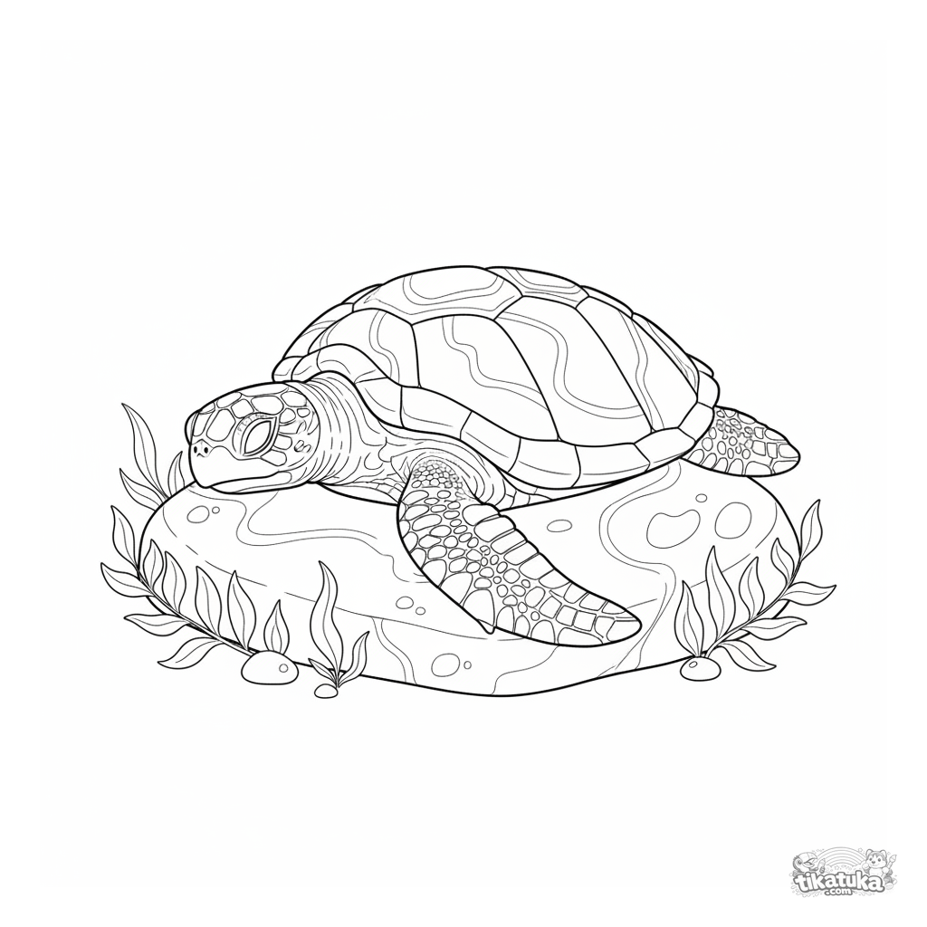 Раскраска для детей 10-12 лет: детализированная морская черепаха спит на плоском камне в солнечных лучах на мелководье. Натуралистичные текстуры панциря, спокойная сцена.