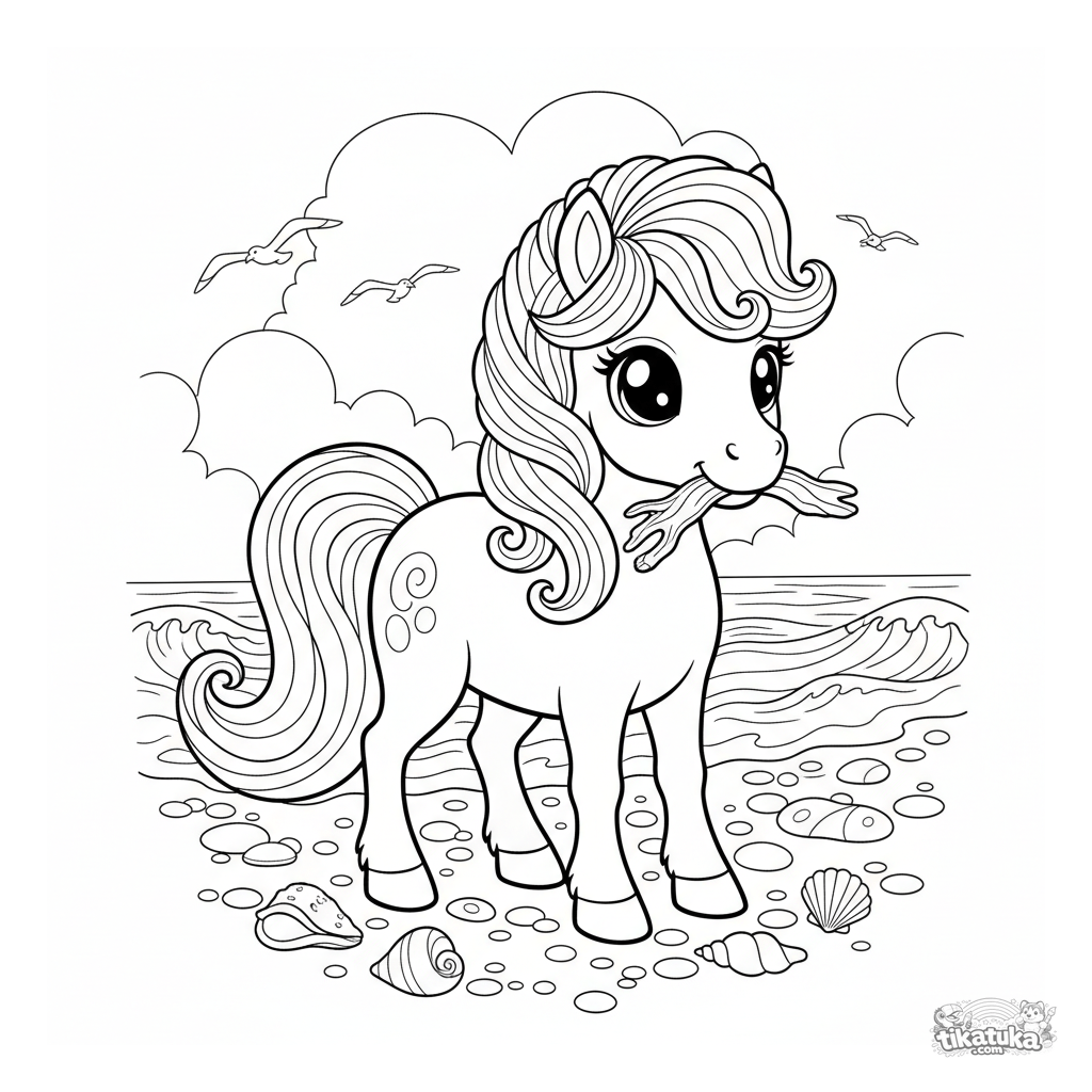 Раскраска с морской пони, собирающей коряги на туманном галечном пляже. Для девочек 4-6 лет. Спокойная и волшебная сцена у моря.
