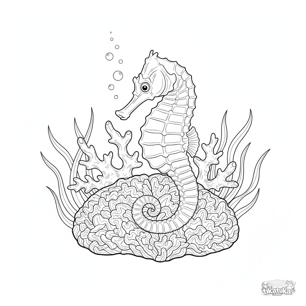 Раскраска с подводным миром для детей 7-12 лет. Морской конек обвивает хвостом ветвистый коралл на дне океана, вокруг колышутся водоросли и пузыри.