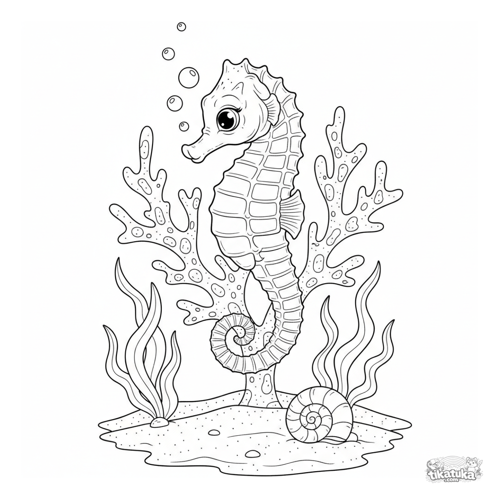 Раскраска для детей 7-12 лет: детализированный морской конек обвивает ветвистый коралл в солнечном подводном саду с пузырьками.