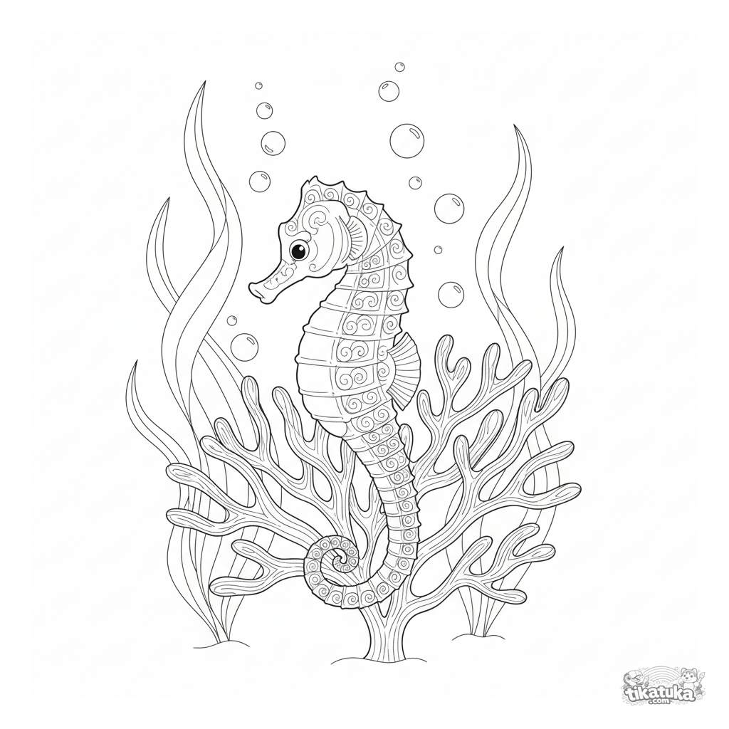 Детализированная раскраска для детей 7-12 лет с морским коньком. Изображен подводный мир: конек обвивает коралл в лесу водорослей, много линий и текстур.