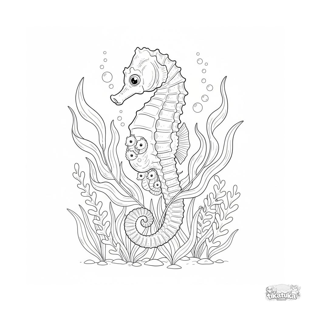 Детализированная раскраска с морским коньком-отцом, несущим малышей в солнечном саду из водорослей на мелководье. Для детей 10-12 лет.