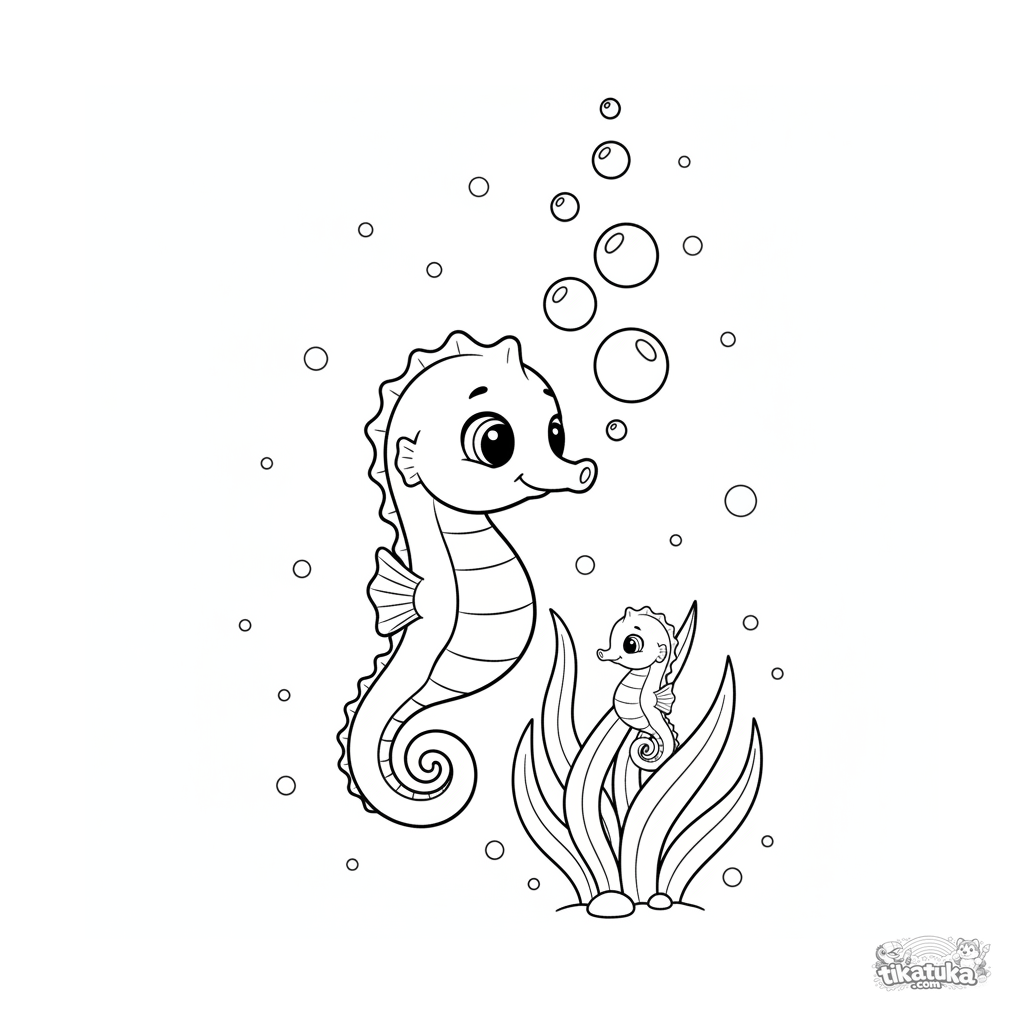 Раскраска для детей 4-6 лет: семейство морских коньков в лучах солнца на мелководье среди морской травы. Милая и простая сцена для творчества.
