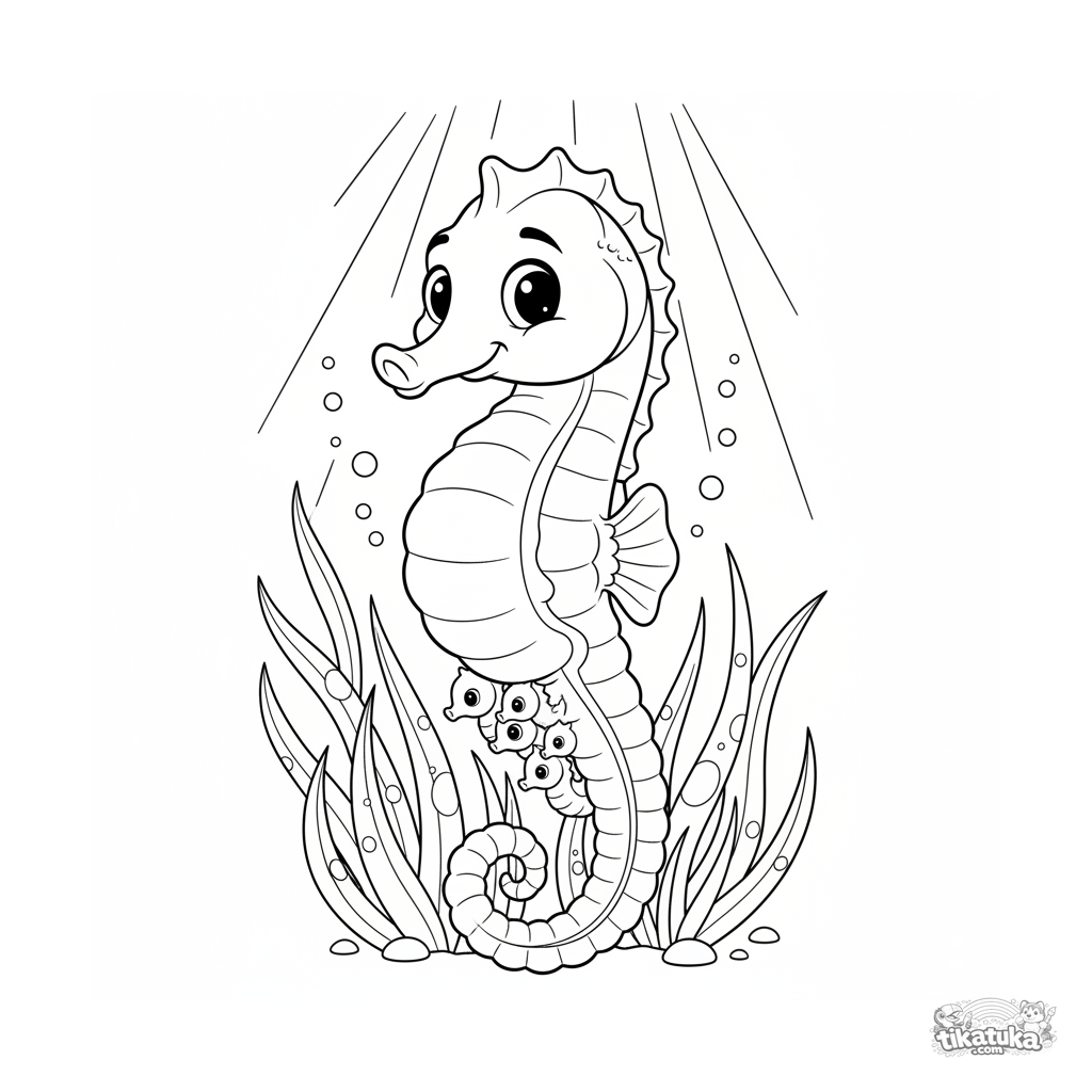 Раскраска для детей 4-6 лет: морской конёк-папа плывёт с малышами в лучезарных зарослях водорослей на мелководье. Милая сцена для развития моторики.