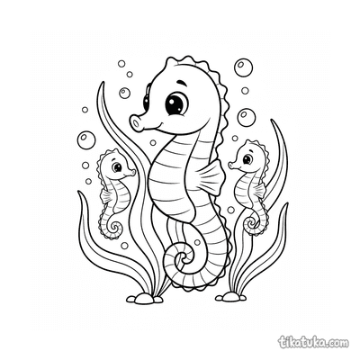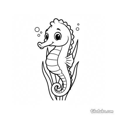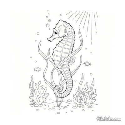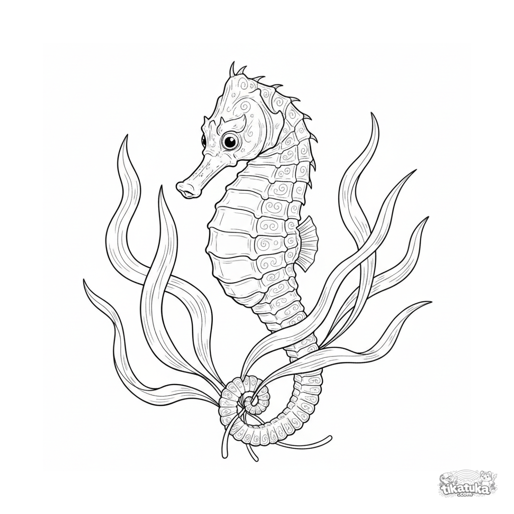 Детальная раскраска в стиле старинной гравюры: морской конёк, цепляющийся хвостом за водоросль в солнечном мелководье. Для детей от 10 лет.