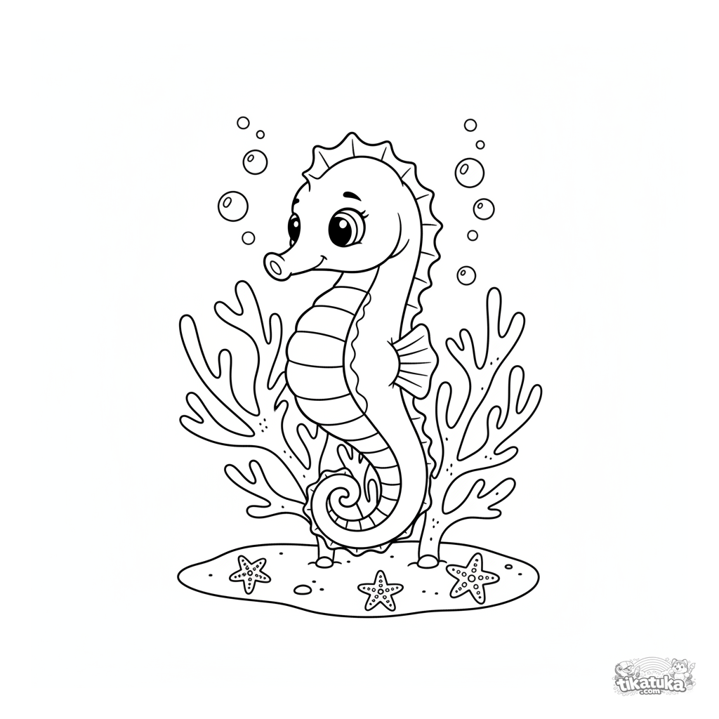 Раскраска для детей 4-6 лет: игривый морской конек кружится среди кораллов в подводном мире. Красочная сцена с умеренной детализацией.