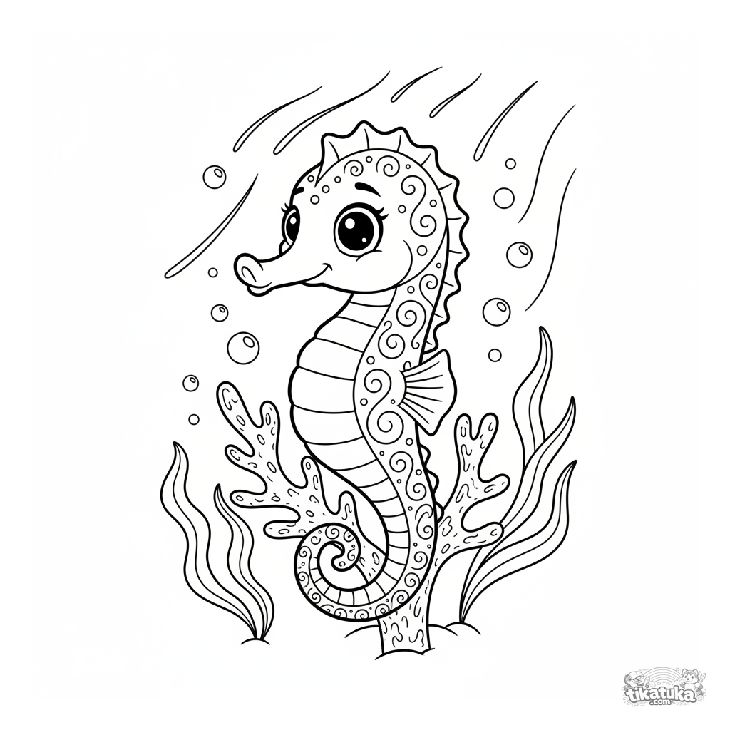 Раскраска для детей 4-6 лет: милый морской конек обвивает хвостом ветку коралла в солнечном подводном мире. Умеренная детализация, дружелюбный стиль.