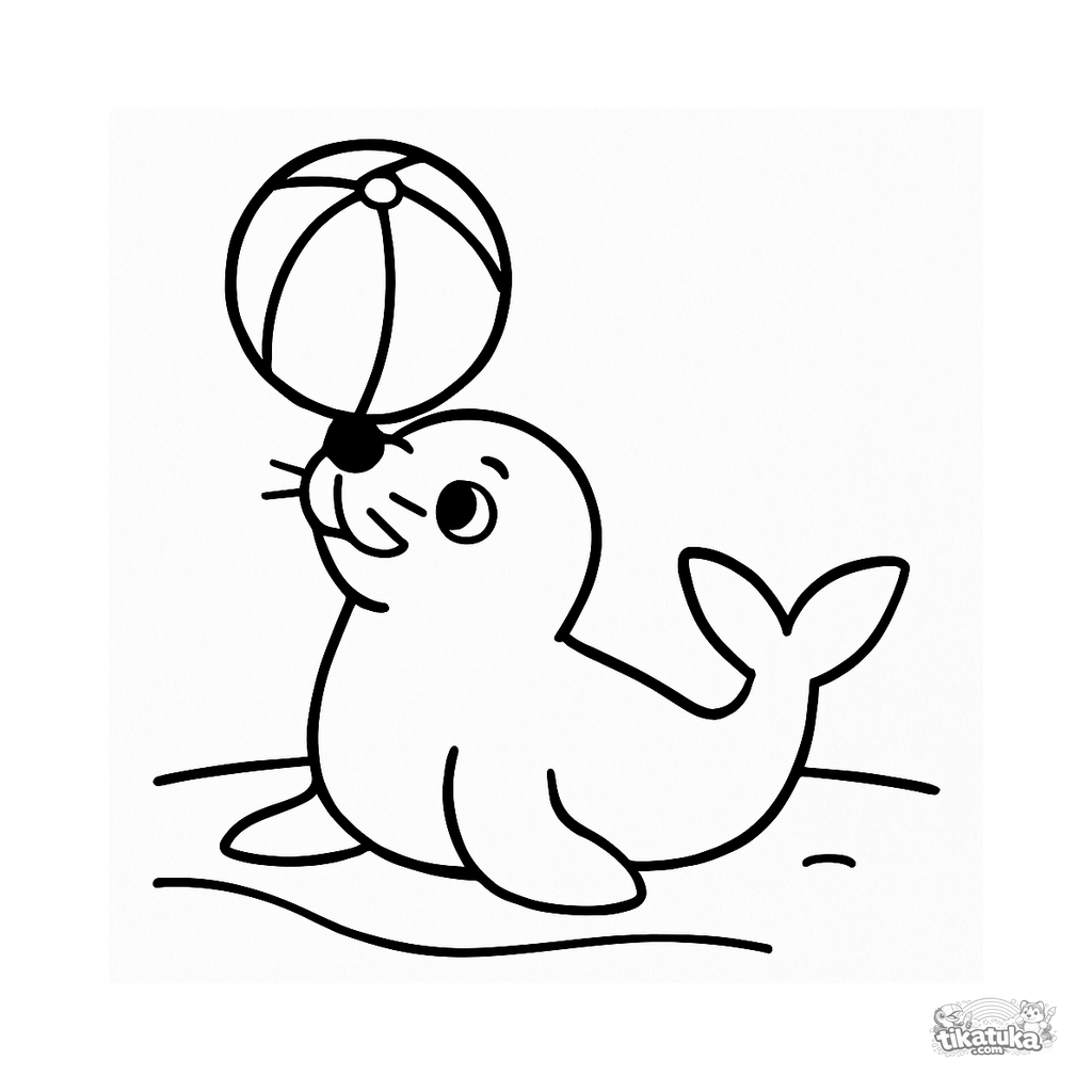 Раскраска для детей 2-5 лет. Милый серый тюлень балансирует разноцветным полосатым пляжным мячом на носу, лежа на песчаном берегу. Скачать бесплатно.