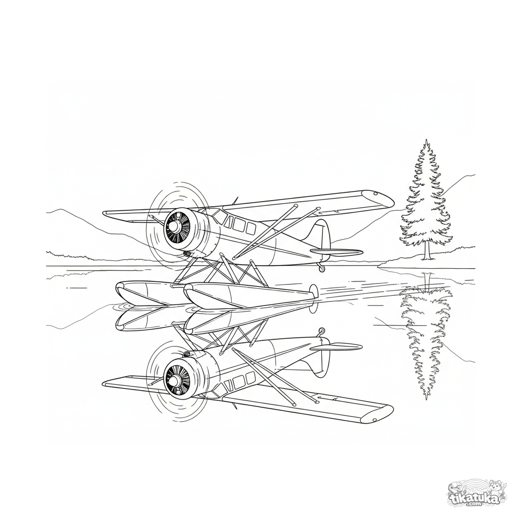Раскраска для детей 7-9 лет: гидросамолёт с поплавками движется по гладкой поверхности горного озера. Чёткие контуры, реалистичные детали, спокойная сцена.