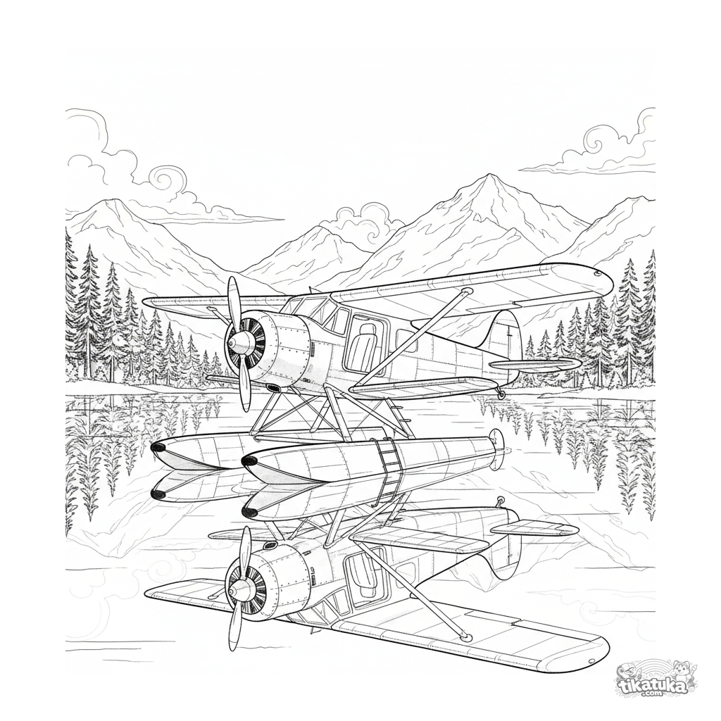 Детализированная раскраска в стиле акварельного скетча: гидросамолет с поплавками стоит на спокойном горном озере. Для детей 10-12 лет. Видно отражение в воде.