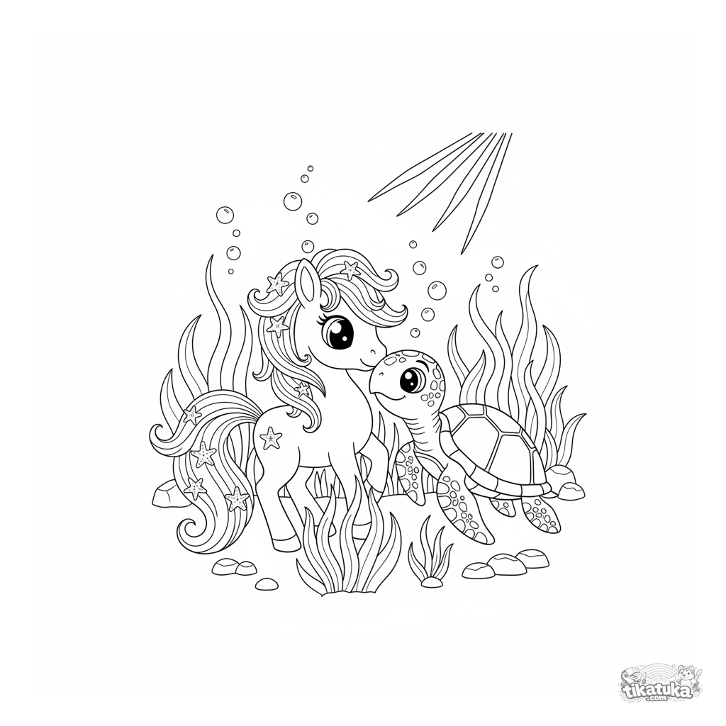 Раскраска для девочек 4-6 лет: волшебный морской пони со светящейся гривой из водорослей дружелюбно общается с морской черепахой в подводном лугу.