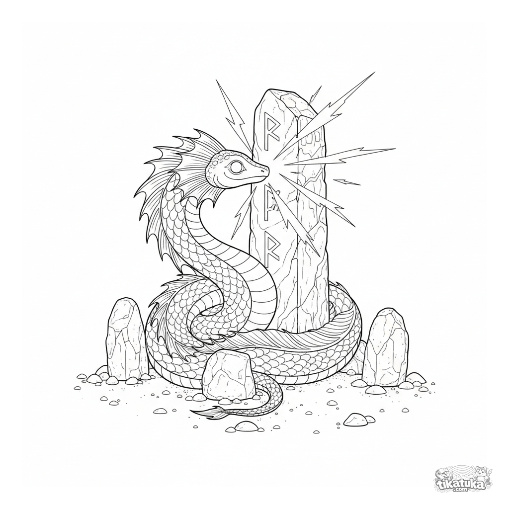 Раскраска для детей 10-12 лет: грациозная морская змея-хранитель обвивает древний рунический монолит. Детализированная сцена в реалистичном стиле для увлеченных художников.
