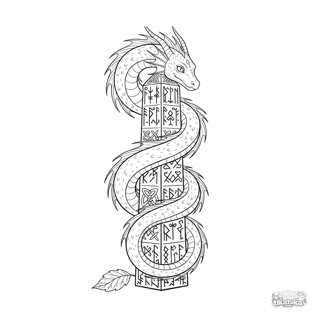 Сложная раскраска для детей 10-12 лет: змеевидный дракон обвивает древний рунический монолит. Детальная анатомия, реалистичные линии, атмосфера легенды.