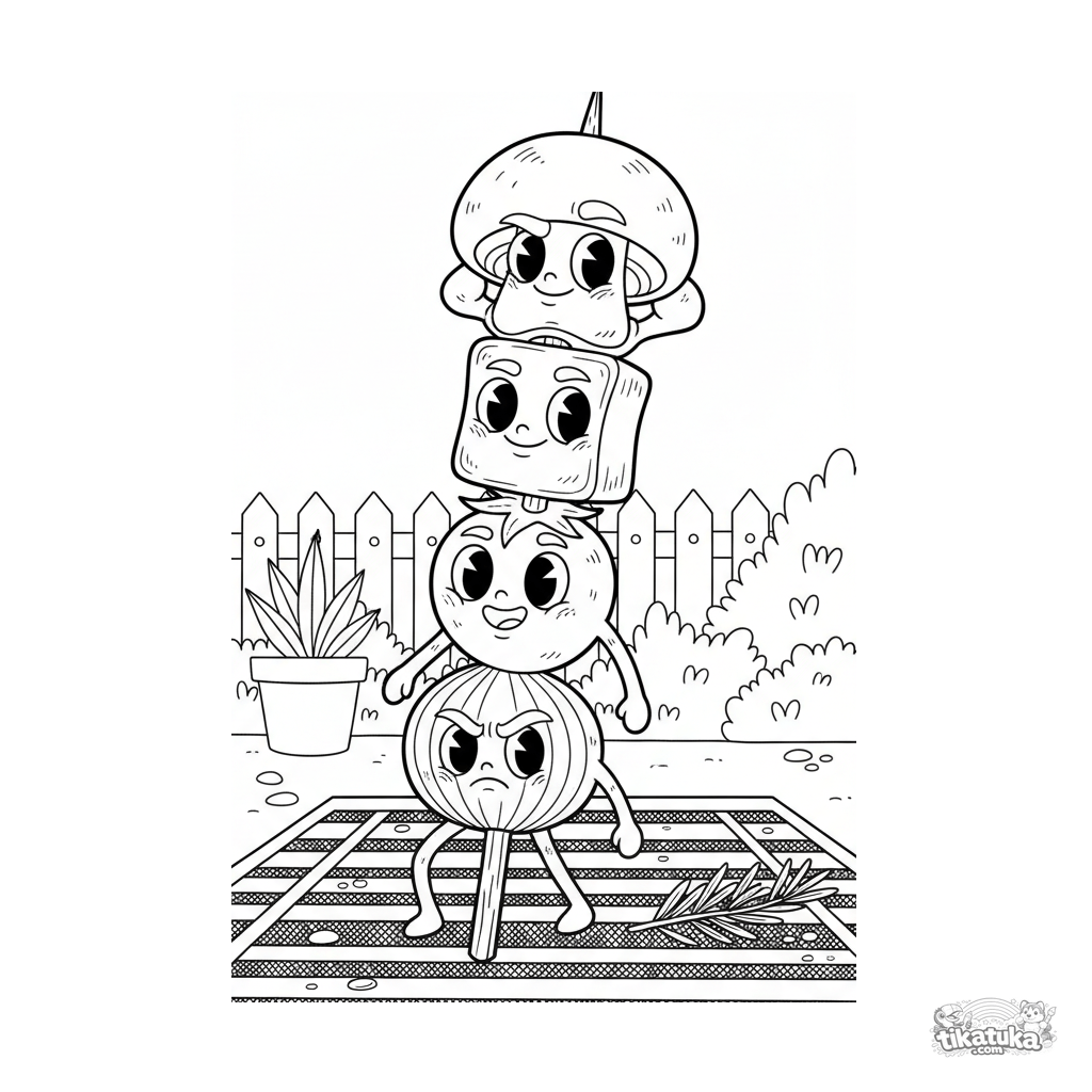 Раскраска для детей 7-9 лет: команда овощей на шпажке марширует по садовому грилю. Динамичная сцена, разные выражения лиц.