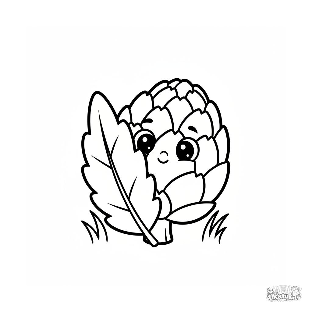 Раскраска для малышей: стеснительный артишок в стиле плюшевой игрушки выглядывает из-за своего листа. Огромные простые формы, широкие поля для раскрашивания.