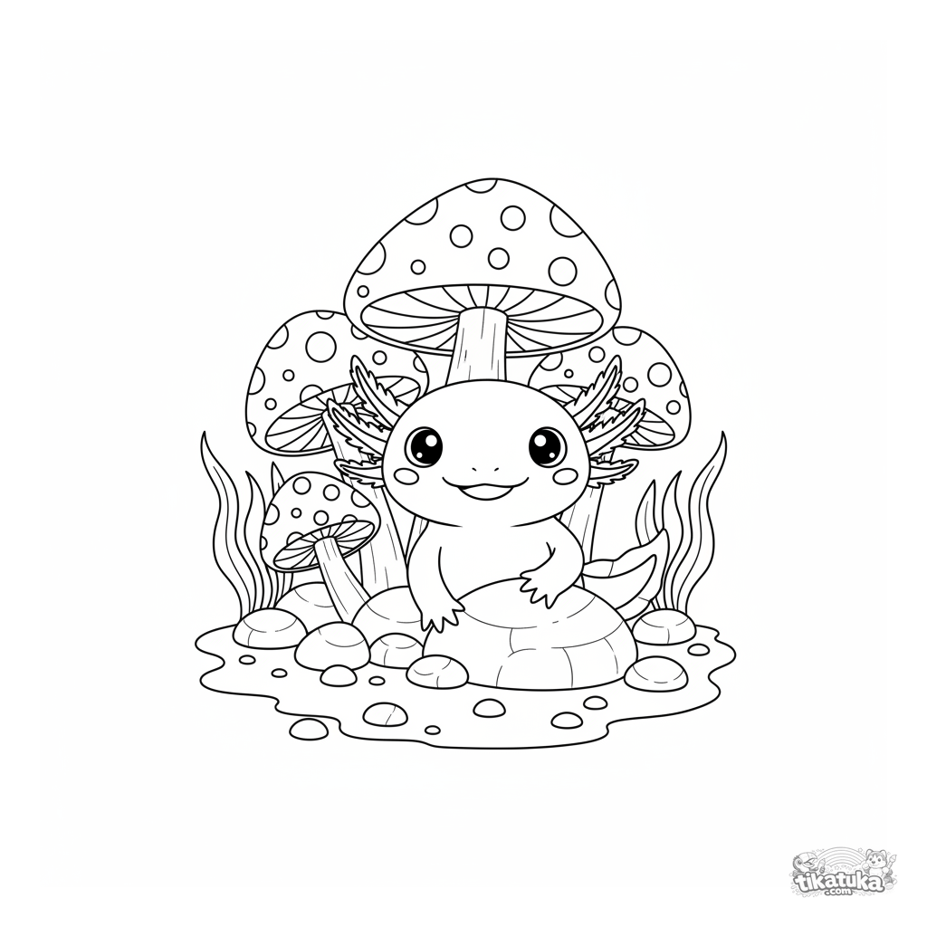 Раскраска для детей 4-6 лет: стеснительный аксолотль выглядывает из-за светящихся грибов в каменистом пруду. Милая подводная сцена с простыми деталями.