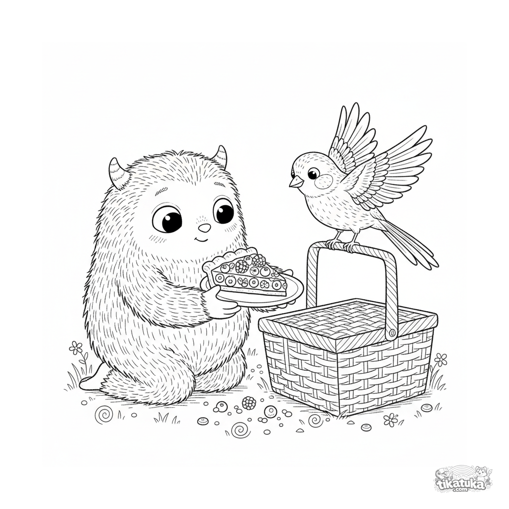 Детальная раскраска в реалистичном стиле: пушистый монстр делится пирогом с птичкой на пикнике. Сцена дружбы и доброты для детей 10-12 лет.