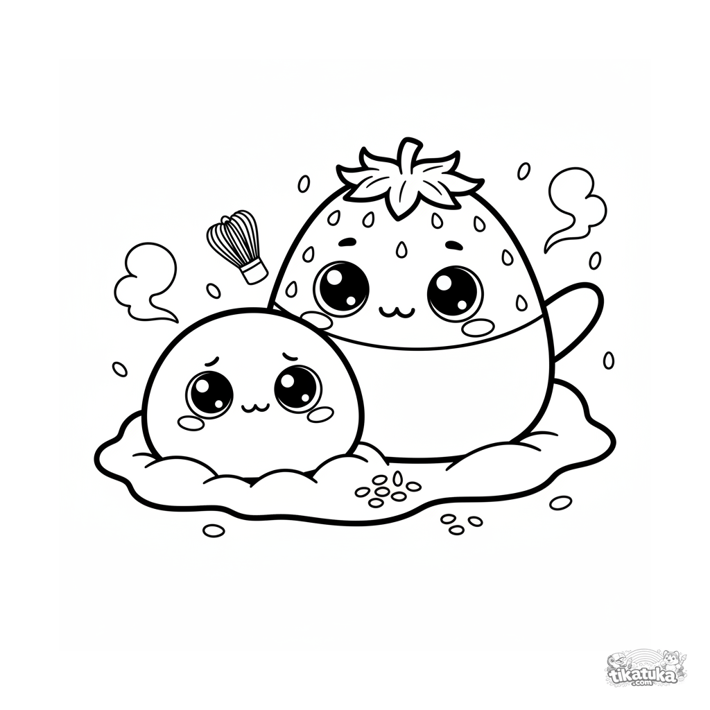 Раскраска для детей 4-6 лет: стеснительный маття-моти прячется за своим другом, клубничным моти. Милая сцена о дружбе и эмоциях.