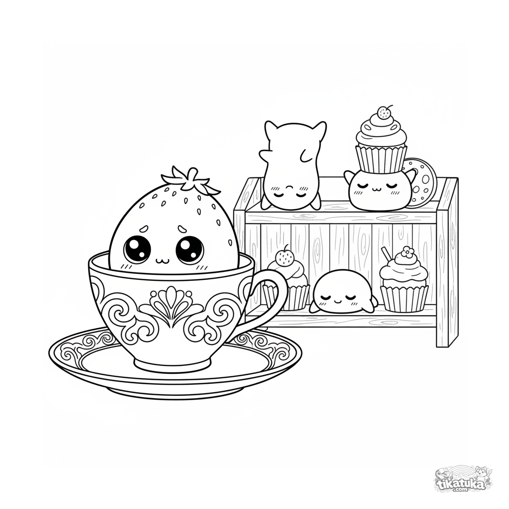 Раскраска для детей 4-6 лет: стеснительное клубничное моти выглядывает из-за чашки на полке со сладостями. Милая сцена с выражением эмоций.