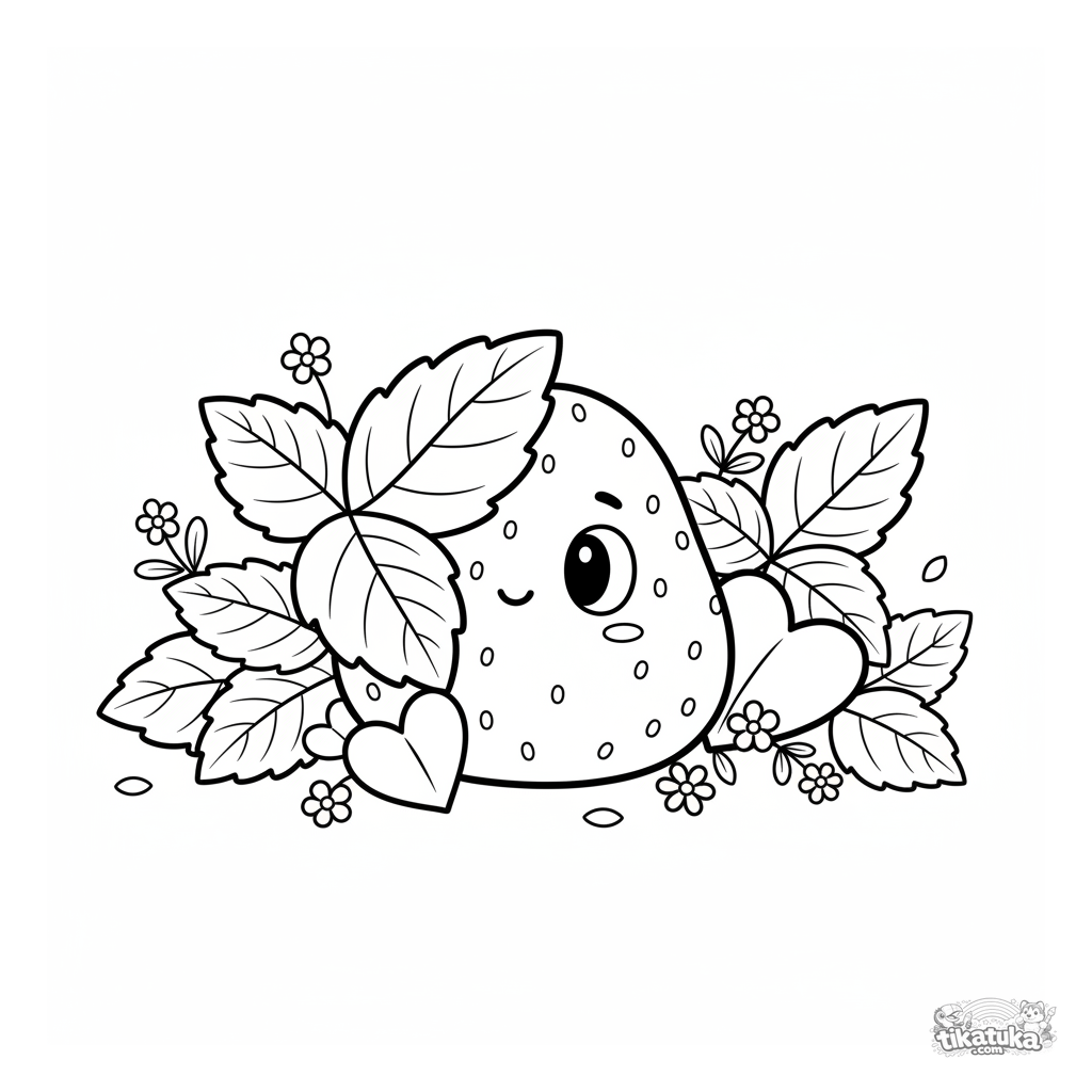 Раскраска для детей 4-6 лет: стеснительный моти выглядывает из-за клубничного листа. Милая сцена в саду с цветами и другими листьями.