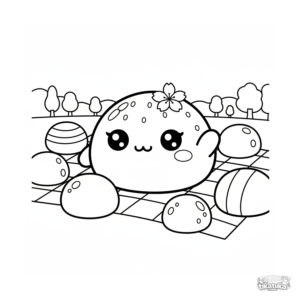 Раскраска для детей 7-9 лет: стеснительный клубничный моти сидит на клетчатом пикник-одеяле среди других моти в уютной сцене.