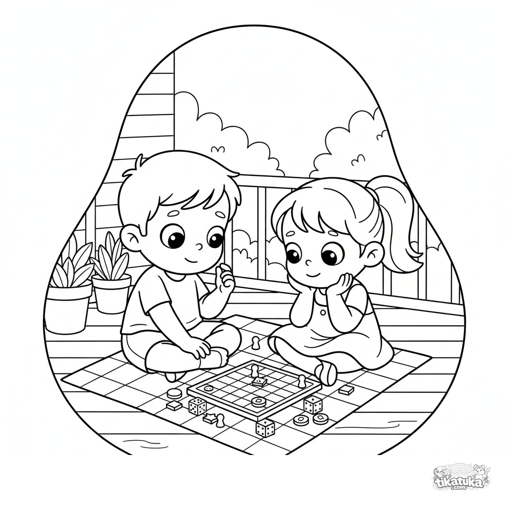 Раскраска для детей 4-6 лет: брат и сестра играют в настольную игру на полу уютной веранды. Яркие, понятные формы и дружеская атмосфера.