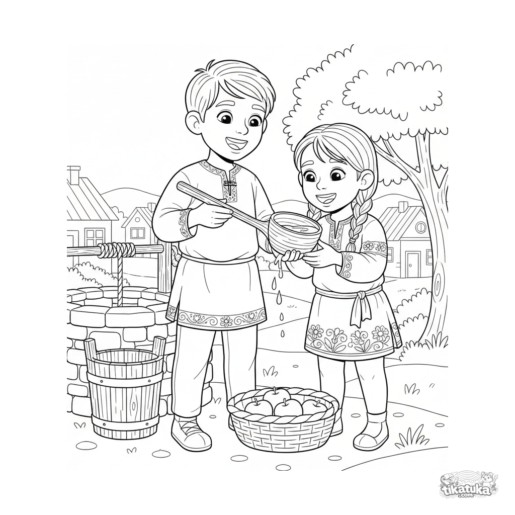 Раскраска для детей 10-12 лет: брат и сестра делятся водой из колодца с живой водой. Реалистичный стиль полевого определителя, сцена в центре.