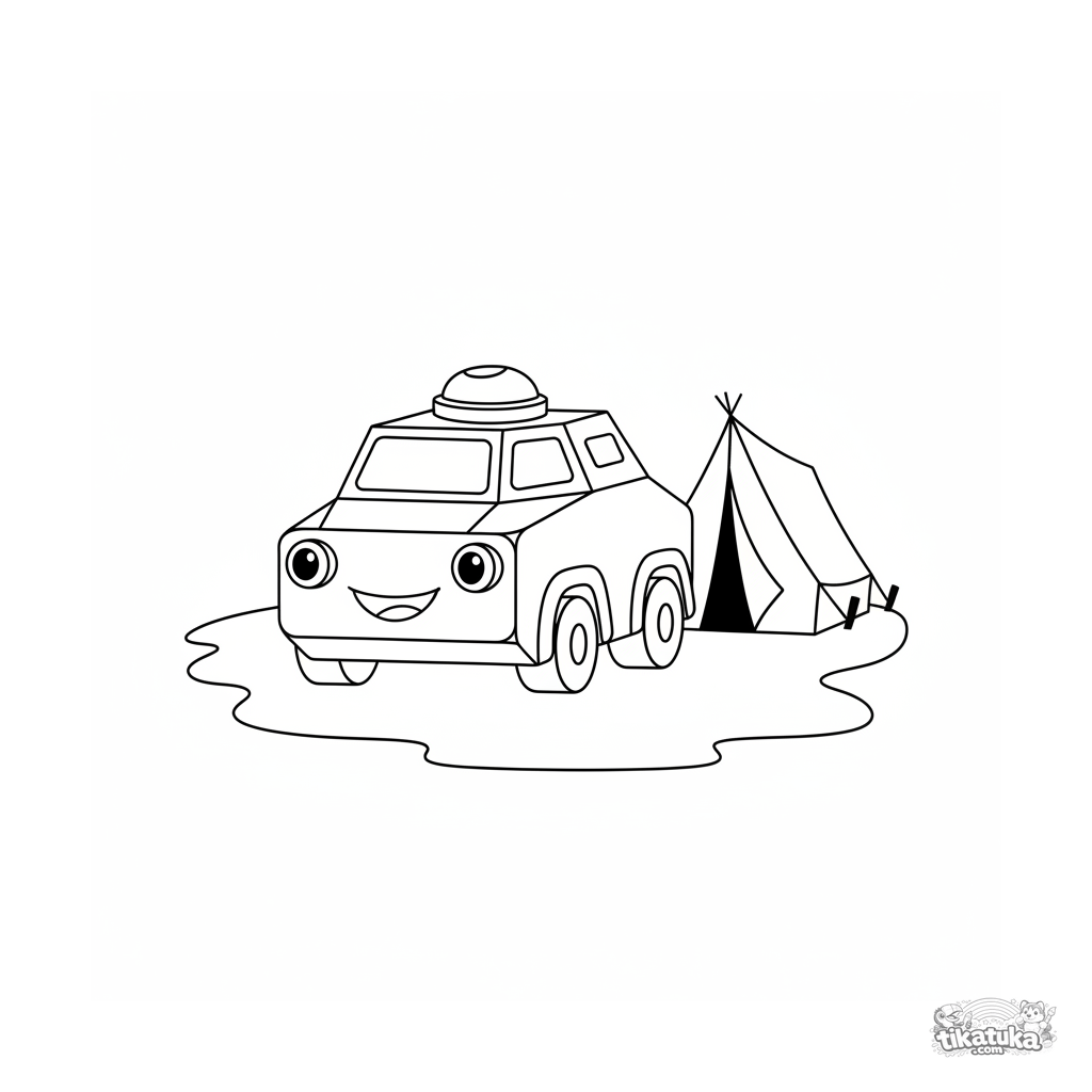 Простая раскраска для малышей 2-3 года: дружелюбный бронеавтомобиль с улыбкой стоит возле палатки полевого штаба.