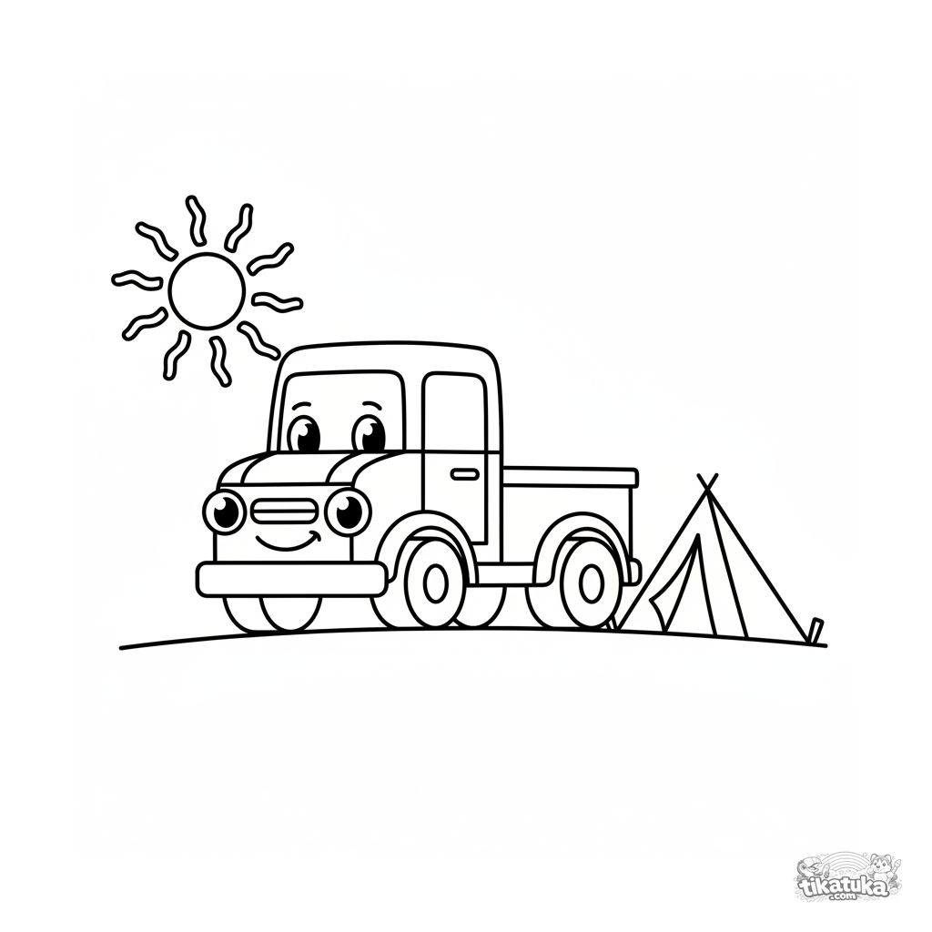 Очень простая раскраска для малышей 2-3 лет: улыбающийся армейский грузовик стоит у палатки. Огромные белые поля, толстые контуры, большие области для закрашивания.